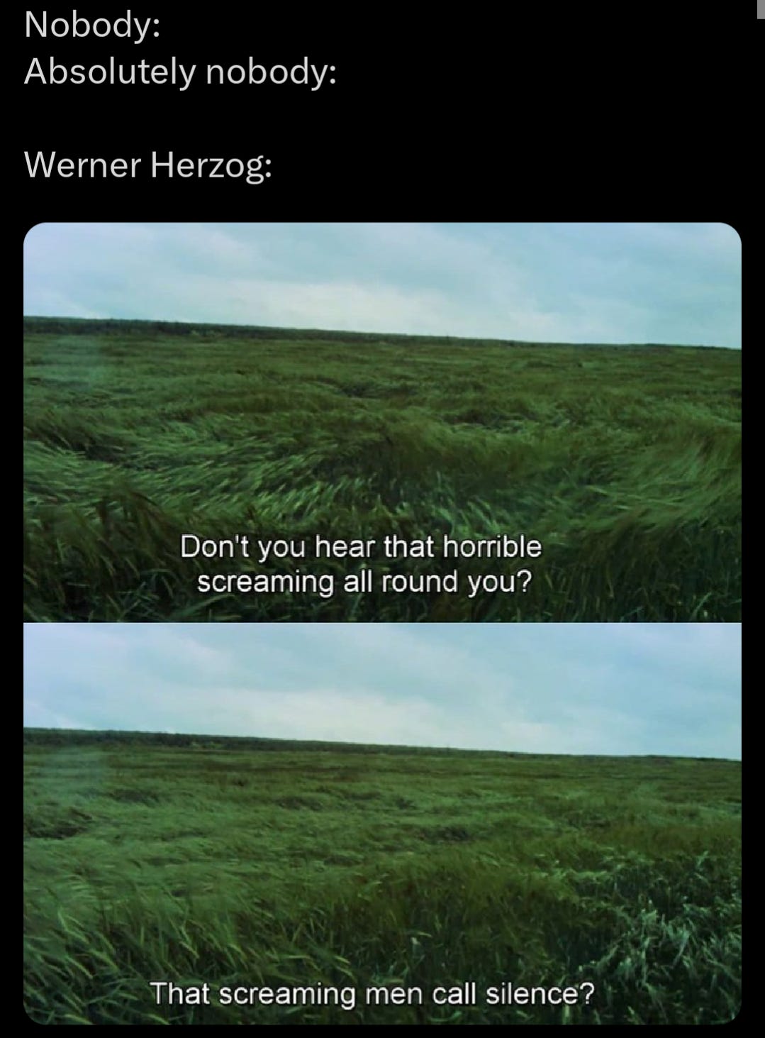 No one would have ever asked for Grizzly Man, or Even Dwarves Started Small, or Fitzcarraldo. Not because No One wanted them, but because no one excepting Werner could have possibly dreamed them up and actually made them happen. Truly No One wanted them until they existed, and then Somebody certainly did.